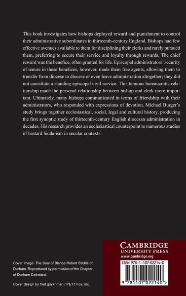 This book investigates how bishops deployed reward and punishment to control their administrative subordinates in thirteenth-century England. Bishops had few effective avenues available to them for disciplining their clerks and rarely pursued them, preferring to secure their service and loyalty through rewards. The chief reward was the benefice, often granted for life. Episcopal administrators' security of tenure in these benefices, however, made them free agents, allowing them to transfer from diocese to diocese or even leave administration altogether; they did not constitute a standing episcopal civil service. This tenuous bureaucratic relationship made the personal relationship between bishop and clerk more important. Ultimately, many bishops communicated in terms of friendship with their administrators, who responded with expressions of devotion. Michael Burger's study brings together ecclesiastical, social, legal and cultural history, producing the first synoptic study of thirteenth-century English diocesan administration in decades. His research provides an ecclesiastical counterpoint to numerous studies of bastard feudalism in secular contexts.