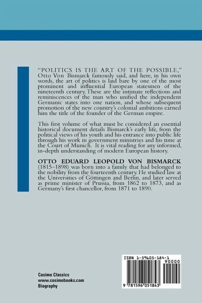 "Politics is the art of the possible," Otto Von Bismarck famously said, and here, in his own words, the art of politics is laid bare by one of the most prominent and influential European statesmen of the nineteenth century. These are the intimate reflections and reminiscences of the man who unified the independent Germanic states into one nation, and whose subsequent promotion of the new country's colonial ambitions earned him the title of the founder of the German empire. This first volume of what must be considered an essential historical document details Bismarck's early life, from the political views of his youth and his entrance into public life through his work in government ministries and his time at the Court of Munich. It is vital reading for any informed, in-depth understanding of modern European history. AUTHOR BIO: OTTO EDUARD LEOPOLD VON BISMARCK (1815-1898) was born into a family that had belonged to the nobility from the fourteenth century. He studied law at the Universities of Göttingen and Berlin, and later served as prime minister of Prussia, from 1862 to 1873, and as Germany's first chancellor, from 1871 to 1890.