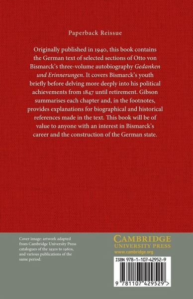 Originally published in 1940, this book contains the German text of selected sections of Otto von Bismarck's three-volume autobiography Gedanken und Erinnerungen. It covers Bismarck's youth briefly before delving more deeply into his political achievements from 1847 until retirement. Gibson summarises each chapter and, in the footnotes, provides explanations for biographical and historical references made in the text. This book will be of value to anyone with an interest in Bismarck's career and the construction of the German state.