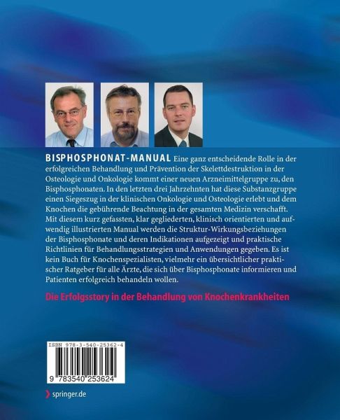"Mit dem kurz gefassten, klar gegliederten, klinisch orientierten und aufwendig illustrierten Bisphosphonat-Manual werden die Struktur-Wirkungsbeziehungen der Bisphosphonate und deren Indikationen in der klinischen Onkologie und Osteologie aufgezeigt. Ein besonderer Augenmerk wurde von den Autoren ... auf die praktischen Richtlinien für Behandlungsstrategien und Anwendungen gelegt. Das Manual sieht sich ... als praktischer Ratgeber für alle Ärzte, die sich über Bisphosphonate informieren und Patienten erfolgreich beraten und behandeln wollen ..."