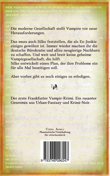 Die moderne Gesellschaft stellt Vampire vor neue Herausforderungen.Das muss auch Silke feststellen, die als Ex-Junkie einiges gewöhnt ist. Immer wieder machen ihr die deutsche Bürokratie und allzu neugierige Nachbarn zu schaffen. Und weit und breit keine geheime Vampirgesellschaft, die hilft.Silke entwickelt einen Plan, um endgültig unterzutauchen. Aber vorher gibt es noch einiges zu erledigen.Ein Crossover aus Urban Fantasy und Krimi Noir mit einem kräftigen Schuss schwarzem Humor.