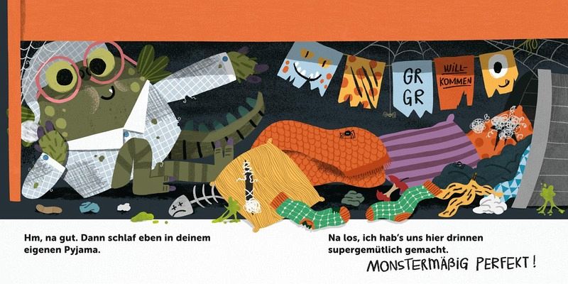 Das starke und wirklich böse Monster lädt zu einer monstermäßigen Übernachtungsparty ein. Sogar einen richtig gruseligen Pyjama hat es für seinen Kumpel rausgesucht. Aber ... was macht es denn da unten? Was für eine Frage! Natürlich schlafen echte Monster UNTER dem Bett, das weiß doch jeder. Ob der Kumpel auch Lust hat, sich in die wunderbar faulige Monsterhöhle zu kuscheln?