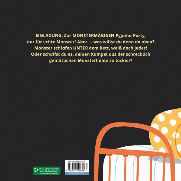 Das starke und wirklich böse Monster lädt zu einer monstermäßigen Übernachtungsparty ein. Sogar einen richtig gruseligen Pyjama hat es für seinen Kumpel rausgesucht. Aber ... was macht es denn da unten? Was für eine Frage! Natürlich schlafen echte Monster UNTER dem Bett, das weiß doch jeder. Ob der Kumpel auch Lust hat, sich in die wunderbar faulige Monsterhöhle zu kuscheln?