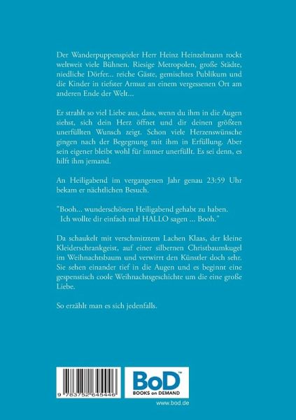Der weltweit reisende Wanderpuppenspieler Herr Heinz Heinzelmann rockt viele Bühnen. Riesige Metropolen, große Städte, niedliche Dörfer... reiche Gäste, gemischtes Publikum und die Kinder in tiefster Armut an einem vergessenen Ort am anderen Ende der Welt.Er strahlt so viel Liebe aus, dass, wenn du ihm in die Augen siehst, sich dein Herz öffnet und dir deinen größten unerfüllten Wunsch zeigt. Schon viele Herzenswünsche gingen nach der Begegnung mit ihm in Erfüllung. Aber sein eigener bleibt wohl für immer unerfüllt. Es sei denn, es hilft ihm jemand.An Heiligabend im vergangenen Jahr genau 23:59 Uhr bekam ernächtlichen Besuch."Booh... wunderschönen Heiligabend gehabt zu haben. Ich wollte dir einfach mal HALLO sagen... Booh."Da schaukelt mit verschmitztem Lachen Klaas, der kleine Kleiderschrankgeist, auf einer silbernen Christbaumkugel im Weihnachtsbaum und verwirrt den Künstler doch sehr. Die zwei ungleichen Freunde sehen einander tief in die Augen und es beginnt eine gespenstisch coole Weihnachtsgeschichte um die eine große Liebe.So erzählt man es sich jedenfalls.