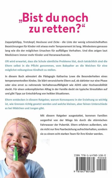 Lehrerverbände schlagen Alarm: Die Anzahl verhaltensauffälliger Kinder explodiert Rund 100.000 Kinder in Deutschland sollen betroffen sein, wobei die Dunkelziffer noch höher liegt. Während die Öffentlichkeit die Fehler vor allem in den Schulen sucht, widersprechen Erziehungswissenschaftler und Pädagogen: Die größte Verantwortung für eine körperlich und seelisch stabile Entwicklung eines Kindes trägt das Elternhaus. Eine falsche Erziehung der Eltern hat fatale Folgen:Zu viele Kinder erfahren in ihrer Familie nicht mehr, was das Wort "Nein" bedeutet. Toleranz und Respekt können sich auf diese Weise nicht herausbilden. Veränderte Lebenswelten tragen zu dieser Entwicklung bei: Wer quengelt, bekommt schnell Tablet oder Smartphone. Eltern machen sich so manipulierbar, was fatal für die kindliche Psyche ist. Erwartungen an Kinder steigen kontinuierlich an. Statt die individuelle Entfaltung zu fördern, wird der Nachwuchs immer mehr zum Leistungsträger. Kinderärzte sprechen davon, dass bis zu 30 % ihrer kleinen Patienten psychische Auffälligkeiten zeigen (Studie des Berufsverbands der Kinder- und Jugendärzte) Sicher, jeder wünscht sich pflegeleichte Kinder. Doch muss es erst so weit kommen, dass ein Kind als auffällig abgestempelt wird? Möchten Sie nicht lieber die Ursachen kennen, die Kind überhaupt "schwierig" werden lassen, sodass Sie früh gezielte Maßnahmen ergreifen können? Und Ihr Kind gesund und glücklich aufwachsen kann? Katharina Lowe hat viele Jahre Erfahrung als Schulsozialarbeiterin. Ihre Berufspraxis führte zu dem einzigartigen Konzept einer Elternschule, die sich den Herausforderungen der Kindererziehung widmet. Denn glückliche und starke Kinder brauchen von Beginn an kompetente Eltern. Die gefragte Referentin hat nun unverzichtbares Hintergrundwissen zusammengestellt und gibt in ihrem Buch Tipps, wie Eltern "schwierigen" Kindern richtig begegnen:Temperamentvolles Kind - ist das eine Phase oder ein unveränderlicher Wesenszug? Lesen Sie, wie Sie merken, ob Ihr Kind tatsächlich schwieriger erziehbar ist als andere. Manchmal ist die Grenze zwischen einem gesunden Temperament und einer Verhaltensauffälligkeit wie ADHS oder Hochsensibilität nicht direkt erkennbar - die Autorin gibt Ihnen Tipps, wie Sie das bei Ihrem Kind feststellen können. Typische Stressfallen mit Kindern im Restaurant, Bus oder Supermarkt entschärft - Quengeln muss kein Dauerzustand bleiben! Schlagen Sie Kapitel 5 auf und Sie werden ein Füllhorn an Ratschlägen finden, wie Sie als Eltern problematische Alltagssituationen überleben und Ihr Kind gleichzeitig stärken. Wie Sie klare Grenzen setzen und selbst in kniffligen Situationen konsequent bleiben Hochsensible Kinder - wie Sie mit dieser speziellen Herausforderung umgehen Schwierige Jungs, zickige Mädchen - Tipps, damit sich beide Geschlechter optimal entfalten können und die Pubertät nicht zum Albtraum wird. Paare werden Eltern: Wie Sie sich selbst nicht verlieren und bei der Kindererziehung zum unschlagbaren Team werden Überforderung muss selbst mit dem temperamentvollsten Kind nicht sein! Mit diesem Buch haben Sie endlich einen Ratgeber, der Ihnen von der Wiege bis zum Ende der Pubertät ein unschätzbarer Wegbegleiter sein wird. Bestellen Sie jetzt Ihr Exemplar!