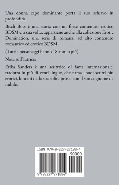 Una donna capo dominante porta il suo schiavo in profondità. Bitch Boss è una storia con un forte contenuto erotico BDSM e, a sua volta, appartiene anche alla collezione Erotic Domination, una serie di romanzi ad alto contenuto romantico ed erotico BDSM. (Tutti i personaggi hanno 18 anni o più) Nota sull'autrice: Erika Sanders è una scrittrice di fama internazionale, tradotta in più di venti lingue, che firma i suoi scritti più erotici, lontani dalla sua solita prosa, con il suo cognome da nubile.