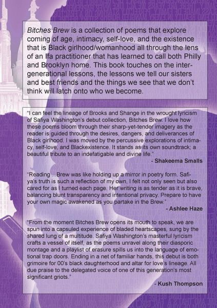 Bitches Brew is a collection of poems that explore coming of age, intimacy, self-love, and the existence that is Black girlhood/womanhood all through the lens of an Ifa practitioner that has learned to call both Philly and Brooklyn home. This book touches on the intergenerational lessons, the lessons we tell our sisters and best friends and the things we see that we don't think will latch onto who we become. "I can feel the lineage of Brooks and Shange in the wrought lyricism of Safiya Washington's debut collection, Bitches Brew. I love how these poems bloom through their sharp-yet-tender imagery as the reader is guided through the desires, dangers, and deliverances of Black girlhood. I was moved by the percussive explorations of intimacy, self-love, and Blackexistence. It stands as its own soundtrack; a beautiful tribute to an indefatigable and divine life."- Shakeema Smalls "Reading ...Brew was like holding up a mirror in poetry form. Safiya's truth is such a reflection of my own, I felt not only seen but also cared for as I turned each page. Her writing is as tender as it is brave, balancing blunt transparency and intentional privacy. Prepare to have your own magic awakened as you partake in the Brew." - Ashlee Haze "From the moment Bitches Brew opens its mouth to speak, we are spun into a capsuled experience of bladed heartscapes, sung by the shared lung of a multitude. Safiya Washington's masterful lyricism crafts a vessel of itself, as the poems unravel along their diasporic montage and a playlist of erasure spills us into the language of emotional trap doors. Ending in a net of familiar hands, this debut is both grimoire for 00's black daughterhood and altar for love's lineage. All due praise to the delegated voice of one of this generation's most significant griots." - Kush Thompson
