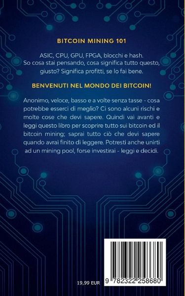 Bitcoin Mining 101 ASIC, CPU, GPU, FPGA, blocchi e hash. So cosa stai pensando, cosa significa tutto questo, giusto? Significa profitti, se lo fai bene. Benvenuti nel mondo dei Bitcoin! Anonimo, veloce, basso e a volte senza tasse - cosa potrebbe esserci di meglio? Ci sono alcuni rischi e molte cose che devi sapere. Quindi vai avanti e leggi questo libro per scoprire tutto sui bitcoin ed il bitcoin mining; saprai tutto ciò che devi sapere quando avrai finito di leggere. Potresti anche unirti ad un mining pool, forse investirai - leggi e decidi.