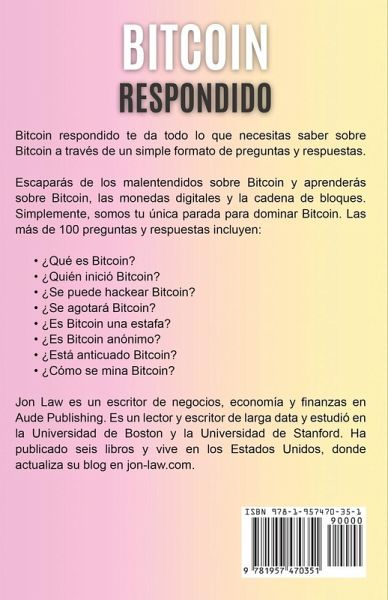 Bitcoin respondido te da todo lo que necesitas saber sobre Bitcoin a través de un simple formato de preguntas y respuestas. Escaparás de los malentendidos sobre Bitcoin y aprenderás sobre Bitcoin, las monedas digitales y la cadena de bloques. Simplemente, somos tu única parada para dominar Bitcoin. Las más de 100 preguntas y respuestas incluyen: * ¿Qué es Bitcoin? * ¿Quién inició Bitcoin? * ¿Se puede hackear Bitcoin? * ¿Se agotará Bitcoin? * ¿Es Bitcoin una estafa? * ¿Es Bitcoin anónimo? * ¿Está anticuado Bitcoin? * ¿Cómo se mina Bitcoin? * ¿Es Bitcoin una buena inversión? * ¿Tiene Bitcoin valor intrínseco? * ¿Fue Bitcoin la primera criptomoneda? * ¿Qué tan popular es Bitcoin? * ¡Y más! Compra Bitcoin respondido ahora.