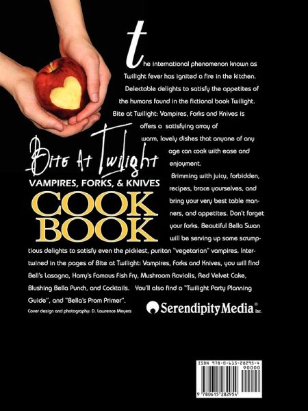 The international phenomenon known as Twilight fever has ignited excitement in the kitchen. Delectable delights to satisfy the appetites of the humans found in the fictional book Bite At Twilight: Vampires, Forks, & Knives, is meant to offer a satisfying array of warm, lovely dishes that anyone of any age can cook with ease and enjoyment. Whether you are planning a Twilight-Themed Birthday Party, just a simple get together with friends, a Halloween party, or just what to try your creative hand to some culinary delights you are in luck. Filled with forbidden love, action, and danger, brace yourself, and bring your very best table manners, and appetites. Don't forget your forks. Beautiful Bella Swan will be serving up some scrumptious delights to satisfy even the pickiest, puritan "vegetarian" vampires. Intertwined in the pages of Bite At Twilight Cookbook: Vampires, Forks, & Knives, you will find Bell's Lasagna, Harry's Famous Fish Fry, Mushroom Raviolis, Red Velvet Cake, Blushing Bella Punch, and much more. Besides mouthwatering recipes, you'll also find a Twilight Party Planning Guide, and for the teenagers, Bell's Prom Primer. "I bought this cookbook on a whim, and love it! The recipes are easy. I made the mushroom ravioli and my family loved it".-Diana, Philadelphia, PA, Amazon customer "Gina, this is brilliant! I have a teen daughter who needs a boost like this to get her nose out of her Twilight books and into the kitchen." Laurie Vengoechea, San Diego Cooking Examiner