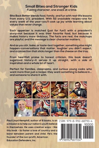 52 Presidential Appetizers with a Side of Character-and Cheese This isn't just a cookbook. It's a stealthy parenting move. A snack-filled history lesson. A weekly excuse to say, "Put down your phone and help me make this." Bite Back Better serves up 52 crowd-pleasing appetizers, each one paired with a true story from a U.S. president and a value like honesty, grit, or knowing when not to duel someone. Will you find Lincoln next to a plate of cheeseballs? Absolutely. Are the snack pairings historically accurate? Not even a little. But the values are timeless, and the stories? 100% real-and sometimes 100% ridiculous. Along the way, you'll:Laugh out loud (at how the presidents "endorse" their dishes) Learn a few things you didn't get from textbooks or cookbooks Create memories that stick (like melted cheese on a baking sheet) Oh, and about the illustrations: some presidents may look like your Uncle Bob in a powdered wig. That's AI for you. We focused on flavor and facts-where it counts. Perfect for families, homeschoolers, or anyone who thinks appetizers should come with a side of meaning, this book is about building character-not just serving snacks. Because when food meets history, and kids meet real conversations, something amazing happens. (And yes, sometimes it involves salsa.)