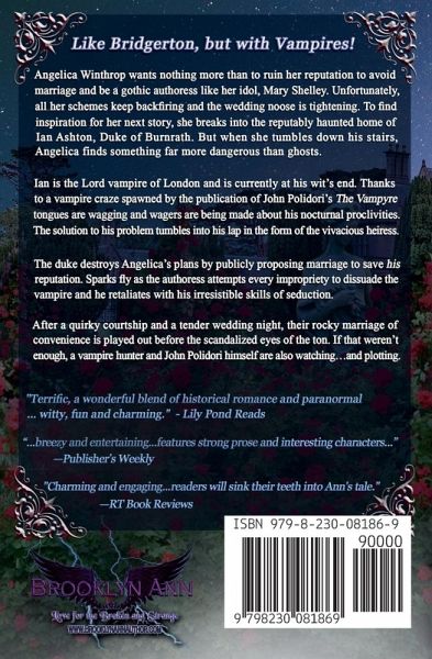 A gothic authoress wants ruin her reputation. A vampire duke is trying to save his. Each seeks to thwart the other's plans. Angelica Winthrop wants to avoid marriage and be a gothic authoress like her idol, Mary Shelley, but her schemes keep backfiring and the wedding noose is tightening. To find inspiration for her next story, she breaks into the reputably haunted home of Ian Ashton, Duke of Burnrath, and finds something far more dangerous than ghosts. Ian is the Lord Vampire of London and is currently at his wit's end. Thanks to a vampire craze spawned by the publication of John Polidori's The Vampyre, tongues are wagging and wagers are being made about his nocturnal proclivities. The solution to his problem tumbles into his lap in the form of a vivacious, trespassing heiress. The duke destroys Angelica's plans by publicly proposing marriage to save his reputation. Sparks fly as the authoress attempts every impropriety to dissuade the vampire. Their rocky courtship plays out before the scandalized eyes of the ton and attracts a vampire hunter. As they face literal and figurative stakes to their hearts, can Ian and Angelica call a truce and discover immortal love? Bite Me, Your Grace is the first book in the tantalizing Scandals with Bite series and can be read as a standalone. If you like Bridgerton, but with a supernatural spin, you'll love Brooklyn Ann's paranormal regency romp. Buy Bite Me, Your Grace today and sink your teeth into a fun and unconventional historical romance!