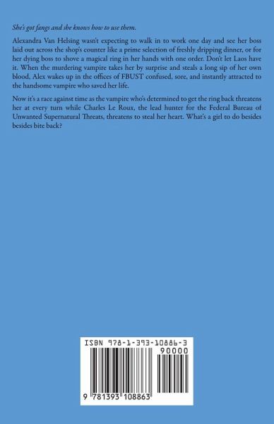 She's got fangs and she knows how to use them. Alexandra Van Helsing wasn't expecting to walk in to work one day and see her boss laid out across the shop's counter like a prime selection of freshly dripping dinner, or for her dying boss to shove a magical ring in her hands with one order. Don't let Laos have it. When the murdering vampire takes her by surprise and steals a long sip of her own blood, Alex wakes up in the offices of FBUST confused, sore, and instantly attracted to the handsome vampire who saved her life. Now it's a race against time as the vampire who's determined to get the ring back threatens her at every turn while Charles Le Roux, the lead hunter for the Federal Bureau of Unwanted Supernatural Threats, threatens to steal her heart. What's a girl to do besides besides bite back?