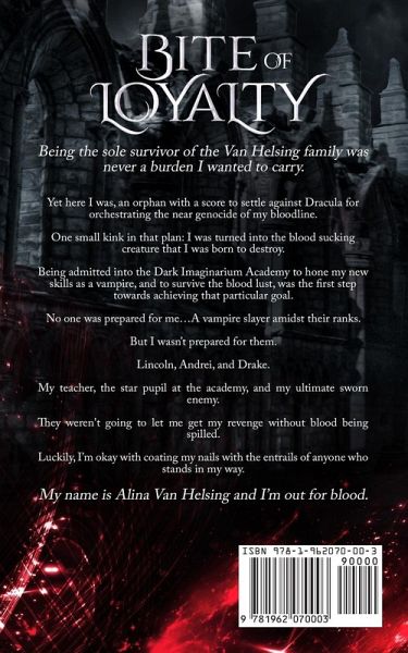 Being the sole survivor of the Van Helsing family was never a burden I wanted to carry. Yet here I am, an orphan with a score to settle against Dracula for orchestrating the near genocide of my bloodline. One small kink in that plan: I was turned into the blood sucking creature that I was born to destroy. Being admitted into the Dark Imaginarium Academy to hone my new skills as a vampire, and to survive the blood lust, is the first step towards achieving my revenge. No one is prepared for me to infiltrate their ranks, but I know they aren't going to let me get my revenge without a fight. But what I'm not ready for is the three vampires that make my blood burn for an entirely different reason. Luckily, I'm okay with coating my nails with the entrails of anyone who stands in my way. My name is Alina Van Helsing and I'm out for blood. *** Bite of Loyalty is the first book in the Blood Oath series. It is a paranormal romance featuring a female lead with a backbone made of steel and three men turn her world upside down on her path for vengeance. If you love enemies to lovers romance, dark secrets, sassy and strong heroines, plus forbidden love- look no further. DARK IMAGINARIUM ACADEMY FEATURES CHARACTERS THAT ARE ALL 18+. THIS IS NOT A HIGH SCHOOL ACADEMY SETTING AND THE CONTENTS ARE INTENDED FOR MATURE AUDIENCES.