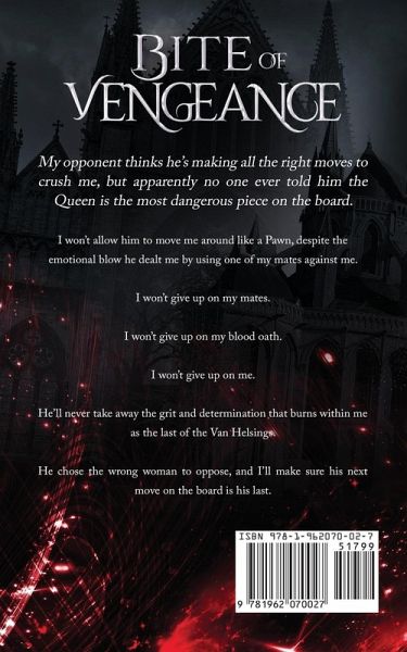 My opponent thinks he's making all the right moves to crush me, but apparently no one ever told him the Queen is the most dangerous piece on the board. I won't allow him to move me around like a Pawn, despite the emotional blow he dealt me by using one of my mates against me. I won't give up on my mates. I won't give up on my blood oath. I won't give up on me. He'll never take away the grit and determination that burns within me as the last of the Van Helsings. He chose the wrong woman to oppose, and I'll make sure his next move on the board is his last. *** Bite of Vengeance is the third book in the Blood Oath series. It is a reverse harem, paranormal romance. If you love enemies to romance, men that only become soft for their girl, dark secrets, sassy and strong heroines, plus forbidden love- look no further. DARK IMAGINARIUM ACADEMY FEATURES CHARACTERS THAT ARE ALL 18+. THIS IS NOT A HIGH SCHOOL ACADEMY SETTING AND THE CONTENTS ARE INTENDED FOR MATURE AUDIENCES.