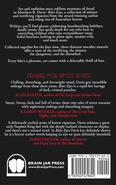 Art and ambition meet sublime moments of dread in Matthew R. Davis' Bites Eyes, a collection of sinister and terrifying vignettes from the award-winning author and rising star of Australian horror. Within, you'll find ghosts celebrating heartbreaking holidays, deadly music that spells death for any who hear it, unsettling children who take extraordinary steps, lethal butchers lurking in plain sight, ancient evils, and much more. Collected together for the first time, these thirteen macabre morsels offer a taste of the terrifying, the sinister, the dangerous, and the disturbed. Every bite's a pleasure, yet comes with a delectable thrill of fear.