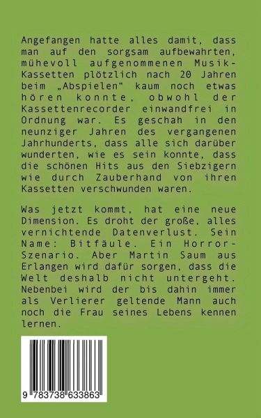 Dieses Buch macht Angst. Wem? Allen, die heute in der modernen Welt leben und aktiv am Geschehen teilnehmen. Das heißt: Jedem, der nur ein einziges soziales Netzwerk nutzt. Um es genau zu sagen: Man muss nicht einmal an irgendetwas aktiv teilnehmen, denn selbst wer im Koma auf der Intensivstation liegt, wird elektronisch verwaltet und nimmt auf diese Art am Geschehen teil. Angefangen hatte alles damit, dass man auf den sorgsam aufbewahrten, mühevoll aufgenommenen Musik-Kassetten plötzlich nach 20 Jahren beim "Abspielen" kaum noch etwas hören konnte, obwohl der Kassettenrecorder einwandfrei in Ordnung war. Es geschah in den neunziger Jahren des vergangenen Jahrhunderts, dass alle sich darüber wunderten, wie es sein konnte, dass die schönen Hits aus den Siebzigern wie durch Zauberhand von ihren Kassetten verschwunden waren. Aber was jetzt kommt, hat eine neue Dimension. Nicht bloß für den Einzelnen, sondern für die ganze Welt. Der schleichende Datenverlust geht um. Es droht der große, alles vernichtende Datenverlust. Sein Name: Bitfäule. Ein Horror-Szenario. Aber Martin Saum, ein Bürger mittleren Alters aus Erlangen, der bisher immer unterschätzt wurde, wird dafür sorgen, dass die Welt deshalb nicht untergeht. Nebenbei wird der bis dahin immer als Verlierer geltende Mann auch noch die Frau seines Lebens kennen lernen.