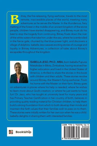 Bitney, the fire-releasing, flying warhorse, travels to the most remote, inaccessible places of the world, meeting many adventures as he serves the Master. In the thunderous, fiery melting of the forest in the middle of an ancient kingdom of the stone people, children have started disappearing, and Bitney must do his best to stop the tragedy from continuing. Bitney floats down the river of the white waters that take him under the sea, where he is embroiled in the fierce gale, churned by the blue power light, and discovers a village of dolphins. Isabella Jeso weaves exciting stories of courage and loyalty in Bitney Adventures, a collection of tales about Bitney's escapades throughout the kingdom.