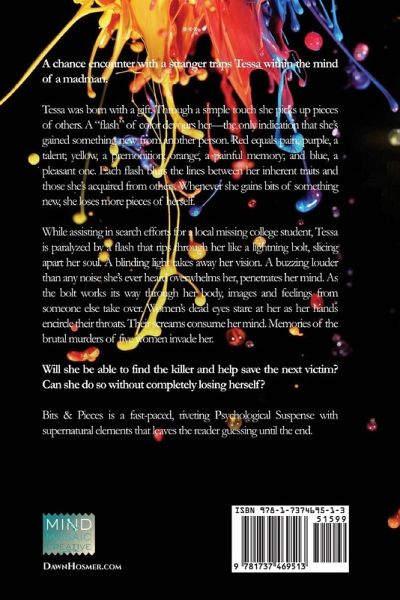 A chance encounter with a stranger traps Tessa within the mind of a madman. Tessa was born with a gift. Through a simple touch she picks up pieces of others. A "flash" of color devours her-the only indication that she's gained something new from another person. Red equals pain; purple, a talent; yellow, a premonition; orange, a painful memory; and blue, a pleasant one. Each flash blurs the lines between her inherent traits and those she's acquired from others. Whenever she gains bits of something new, she loses more pieces of herself. While assisting in search efforts for a local missing college student, Tessa is paralyzed by a flash that rips through her like a lightning bolt, slicing apart her soul. A blinding light takes away her vision. A buzzing louder than any noise she's ever heard overwhelms her, penetrates her mind. As the bolt works its way through her body, images and feelings from someone else take over. Women's dead eyes stare at her as her hands encircle their throats. Their screams consume her mind. Memories of the brutal murders of five women invade her. Will she be able to find the killer and help save the next victim? Can she do so without completely losing herself? Bits & Pieces is a fast-paced, riveting Psychological Suspense with supernatural elements that leaves the reader guessing until the end.