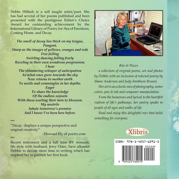 Bits & Pieces a collection of original poems, art and photos by Debbie with an inclusion of selected poetry by Shane Anderson and Judy Smithson Brunet. Her art is an eclectic mix of photography, water colors, pen & ink and computer manipulation. From the humorous and lyrical to the heartfelt realism of life's pathways, her poetry speaks to people of all ages and walks of life. Read and enjoy this delightful mix that holds something for everyone.