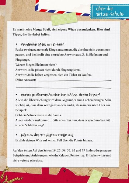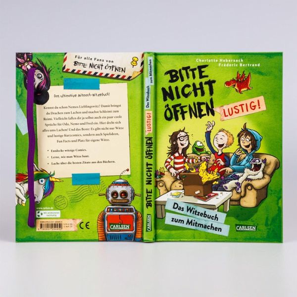 Dieses Witzebuch bietet zahlreiche Witze, eingebettet in den Kosmos der Erfolgsreihe »Bitte nicht öffnen«. Mit Scherzfragen, Kalauern, lustigen Zitaten und Fun Facts übers Lachen. Anleitungen für eigene Witze und witzige Comic-Strips sorgen für Abwechslung. Das interaktive Witzebuch lädt Kinder ein, selbst zum Stift zu greifen, etwa um sich lustige Gespräche zwischen Nemo und Fred auszudenken oder zusammen mit ihren Freund_innen witzige Spielideen zum Kaputtlachen auszuprobieren. In jedem Fall gibt es viel zu lachen beim Entdecken und Verfassen der Lieblingswitze von Nemo, Oda und Fred.