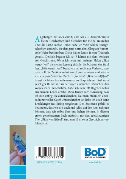 Angefangen hat alles damit, dass ich als Standesbeamtin kleine Geschichten und Gedichte für meine Traureden über die Liebe suchte. Dabei habe ich viele schöne Kurzgeschichten entdeckt, die den ganz normalen Alltag auf humorvolle Weise beschreiben. Diese hätten kaum in eine Traurede gepasst. Deshalb begann ich vor 9 Jahren mit dem Vorlesen von Geschichten. Wenn ich heute mit meinem Plakat "Bitte wend(t)en!" zu meiner Lesung einlade, bleibt kaum ein Stuhl leer. "Bitte wend(t)en!" bedeutet aber nicht nur Vorlesen, sondern soll die Zuhörer selbst zum Lesen anregen und wieder mal ein paar Seiten im Buch zu "wenden". "Bitte wend(t)en!" bringt die Menschen miteinander ins Gespräch und lässt sie in geselliger Runde in Erinnerungen eintauchen. Zwischen den vorgelesenen Geschichten habe ich sehr oft Begebenheiten aus meinem Leben erzählt. Diese fanden so viel Anklang, dass ich nun anfing, sie aufzuschreiben. Da mein Mann ein ebenso humorvoller Geschichtenschreiber ist, habe ich auch seine Erzählungen mit Erfolg vorgelesen. Den Zuhörern gefällt es besonders, dass wir uns auch mal selbst auf den Arm nehmen können, dass wir selbst über uns lachen können. In diesem ersten gemeinsamen Buch, natürlich mit dem gleichnamigen Titel "Bitte wend(t)en!", sind nun 13 unserer Geschichten veröffentlicht.