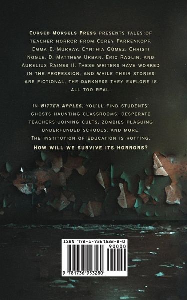 Cursed Morsels Press presents tales of teacher horror from Corey Farrenkopf, Emma E. Murray, Cynthia Gómez, Christi Nogle, D. Matthew Urban, Eric Raglin, and Aurelius Raines II. These writers have worked in the profession, and while their stories are fictional, the darkness they explore is all too real. In Bitter Apples, you'll find students' ghosts haunting classrooms, desperate teachers joining cults, zombies plaguing underfunded schools, and more. The institution of education is rotting. How will we survive its horrors?