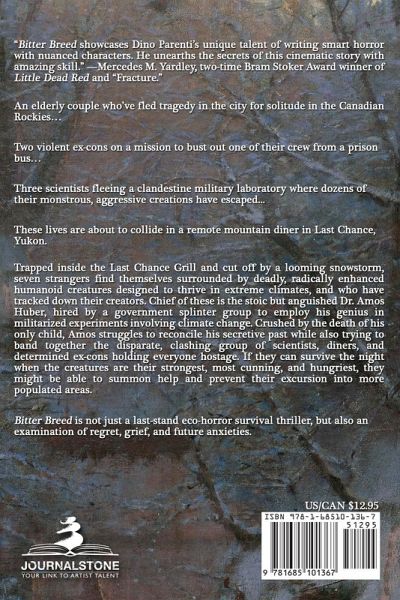 "Bitter Breed showcases Dino Parenti's unique talent of writing smart horror with nuanced characters. He unearths the secrets of this cinematic story with amazing skill." -Mercedes M. Yardley, two-time Bram Stoker Award winner of Little Dead Red and "Fracture." An elderly couple who've fled tragedy in the city for solitude in the Canadian Rockies... Two violent ex-cons on a mission to bust out one of their crew from a prison bus... Three scientists fleeing a clandestine military laboratory where dozens of their monstrous, aggressive creations have escaped... These lives are about to collide in a remote mountain diner in Last Chance, Yukon. Trapped inside The Last Chance Grill and cut off by a looming snowstorm, seven strangers find themselves surrounded by deadly, radically enhanced humanoid creatures designed to thrive in extreme climates, and who have tracked down their creators. Chief of these is the stoic but anguished Dr. Amos Huber, hired by a government splinter group to employ his genius in militarized experiments involving climate change. Crushed by the death of his only child, Amos struggles to reconcile his secretive past while also trying to band together the disparate, clashing group of scientists, diners, and determined ex-cons holding everyone hostage. If they can survive the night when the creatures are their strongest, most cunning, and hungriest, they might be able to summon help and prevent their excursion into more populated areas. Bitter Breed is not just a last-stand, eco-horror survival thriller, but also an examination of regret, grief, and future anxieties.
