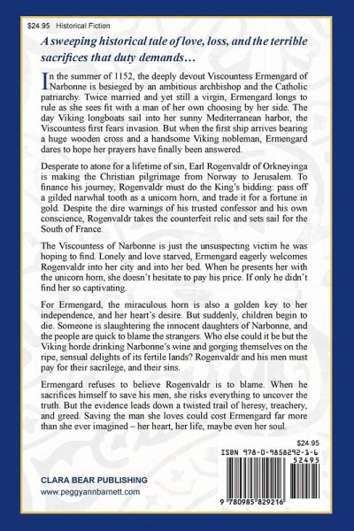 A sweeping Icelandic Saga of love, loss, and the terrible sacrifices that duty demands... Summer 1152: Viscountess Ermengard, ruler of Narbonne, twice married and still a virgin, longs for a husband of her own choosing. When Viking longboats sail into her sunny Mediterranean harbor, she fears invasion. But when the first ship arrives bearing a huge wooden cross and a handsome Viking nobleman, Ermengard dares to hope her prayers have finally been answered. Desperate to atone for a lifetime of sin, Earl Rogenvaldr of Orkneyinga is on a Christian pilgrimage from Norway to Jerusalem. To finance his journey, Rogenvaldr must do the King's bidding: pass off a gilded narwhal tooth as a unicorn horn, and sell it for gold. The unsuspecting Ermengard buys the unicorn horn, but lonely and love starved, she eagerly welcomes Rogenvaldr into into her bed. But, suddenly, someone is slaughtering the innocent daughters of Narbonne! The town is quick to blame the Viking horde drinking Narbonne's wine and gorging on the ripe, sensual delights of its fertile lands and women. Rioting, they imprison Rogenvaldr.Ermengard refuses to believe Rogenvaldr is to blame. Going down a twisted trail of heresy, treachery, and greed, she saves the man she loves. But saving him costs Ermengard far more than she ever imagined - her heart, her life, maybe even her soul.