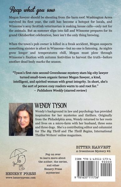 "Tyson's first-rate second Greenhouse mystery stars big-city lawyer turned small-town organic farmer Megan Sawyer, a kind, intelligent, and spirited woman with great integrity. In short, she's the sort of person cozy readers warm to and root for...Tyson populates the cast with a smug-but-attractive PR consultant, a temperamental-but-gifted chef, a shrewd and sexy Scottish vet, and assorted townspeople, whose motives are complex and believable. It's a pleasure to spend time in their company." - Publishers Weekly (starred review) Megan Sawyer should be shouting from the barn roof. Washington Acres survived its first year, the café has become a hotspot for locals, and Winsome's sexy Scottish veterinarian is making house calls-only not for the animals. But as summer slips into fall and Winsome prepares for its grand Oktoberfest celebration, beer isn't the only thing brewing. When the town's pub owner is killed in a freak accident, Megan suspects something sinister is afoot in Winsome-but no one is listening. As nights grow longer and temperatures chill, Megan must plow through Winsome's fixation with autumn festivities to harvest the truth-before another dead body marks the season. "Bitter Harvest is a delightful read. It has everything you could want in a mystery-a spunky heroine with a charming love interest, quirky characters, a setting you desperately want to visit, and a plot that keeps you guessing!" - Amanda Lee, Author of Better Off Thread "An exceptional cozy, Bitter Harvest offers up a veritable feast for mystery fans: a beautifully drawn setting, engaging characters, and plenty of twists and turns that will keep readers guessing. The suspense deepens with every scene…Tyson has crafted a fresh, intelligent, compelling story that's sure to satisfy." - Cynthia Kuhn, Author of The Art of Vanishing "A perfectly-crafted smorgasbord of suspense, family drama and small-town intrigue." - Liz Mugavero, Agatha-Nominated Author of Custom Baked Murder Related subjects include: women sleuths, cozy mysteries, culinary mysteries, amateur sleuth books, murder mysteries, whodunit mysteries (whodunnit), book club recommendations. Books in the Greenhouse Mystery Series: A MUDDIED MURDER (#1) BITTER HARVEST (#2) SEEDS OF REVENGE (Winter 2017) Part of the Henery Press Mystery Series Collection, if you like one, you'll probably like them all… Author Bio: Wendy Tyson's background in law and psychology has provided inspiration for her mysteries and thrillers. Originally from the Philadelphia area, Wendy has returned to her roots and lives there again on a micro-farm with her husband, three sons and three dogs. Wendy's short fiction has appeared in literary journals, and she's a contributing editor and columnist for The Big Thrill and The Thrill Begins, International Thriller Writers' online magazines. Wendy is the author of the Allison Campbell Mystery Series and the Greenhouse Mystery Series.
