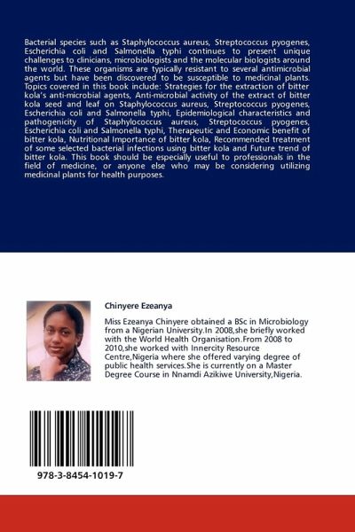 Bacterial species such as Staphylococcus aureus, Streptococcus pyogenes, Escherichia coli and Salmonella typhi continues to present unique challenges to clinicians, microbiologists and the molecular biologists around the world. These organisms are typically resistant to several antimicrobial agents but have been discovered to be susceptible to medicinal plants. Topics covered in this book include: Strategies for the extraction of bitter kola s anti-microbial agents, Anti-microbial activity of the extract of bitter kola seed and leaf on Staphylococcus aureus, Streptococcus pyogenes, Escherichia coli and Salmonella typhi, Epidemiological characteristics and pathogenicity of Staphylococcus aureus, Streptococcus pyogenes, Escherichia coli and Salmonella typhi, Therapeutic and Economic benefit of bitter kola, Nutritional Importance of bitter kola, Recommended treatment of some selected bacterial infections using bitter kola and Future trend of bitter kola. This book should be especially useful to professionals in the field of medicine, or anyone else who may be considering utilizing medicinal plants for health purposes.
