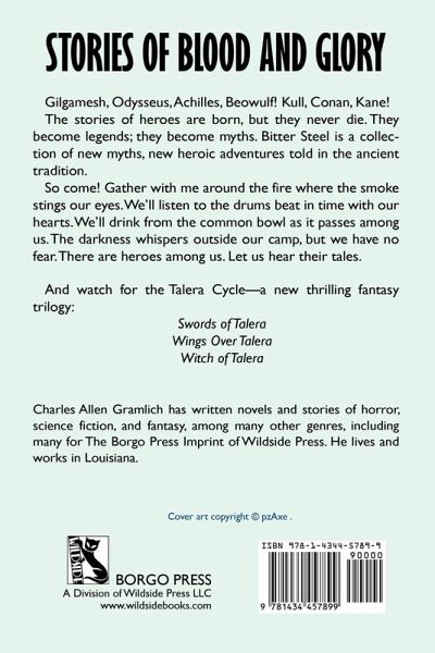 The stories of heroes are born, but they never die. They become legends. They become mythic. Bitter Steel is a collection of new myths and new fantasy adventures in the style of Robert E. Howard's classic fictional heroes, Kull, Conan, and Kane.