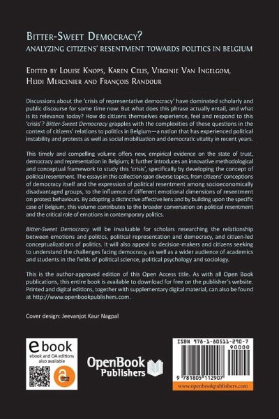 Discussions about the 'crisis of representative democracy' have dominated scholarly and public discourse for some time now. But what does this phrase actually entail, and what is its relevance today? How do citizens themselves experience, feel and respond to this 'crisis'? Bitter-Sweet Democracy grapples with the complexities of these questions in the context of citizens' relations to politics in Belgium-a nation that has experienced political instability and protests as well as social mobilization and democratic vitality in recent years. This timely and compelling volume offers new, empirical evidence on the state of trust, democracy and representation in Belgium; it further introduces an innovative methodological and conceptual framework to study this 'crisis', specifically by developing the concept of political resentment. The essays in this collection span diverse topics, from citizens' conceptions of democracy itself and the expression of political resentment among socioeconomically disadvantaged groups, to the influence of different emotional dimensions of resentment on protest behaviours. By adopting a distinctive affective lens and by building upon the specific case of Belgium, this volume contributes to the broader conversation on political resentment and the critical role of emotions in contemporary politics. Bitter-Sweet Democracy will be invaluable for scholars researching the relationship between emotions and politics, political representation and democracy, and citizen-led conceptualizations of politics. It will also appeal to decision-makers and citizens seeking to understand the challenges facing democracy, as well as a wider audience of academics and students in the fields of political science, political psychology and sociology.