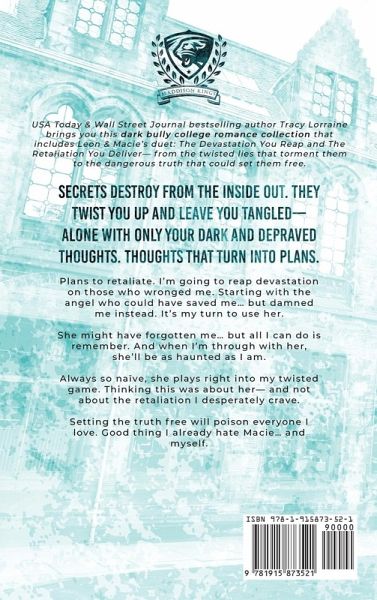USA Today & Wall Street Journal bestselling author Tracy Lorraine brings you this dark bully college romance collection that includes Leon & Macie's duet: The Devastation You Reap and The Retaliation You Deliver- from the twisted lies that torment them to the dangerous truth that could set them free. Secrets destroy from the inside out. They twist you up and leave you tangled- alone with only your dark and depraved thoughts. Thoughts that turn into plans. Plans to retaliate. I'm going to reap devastation on those who wronged me. Starting with the angel who could have saved me... but damned me instead. It's my turn to use her. She might have forgotten me... but all I can do is remember. And when I'm through with her, she'll be as haunted as I am. Always so naïve, she plays right into my twisted game. Thinking this was about her- and not about the retaliation I desperately crave. Setting the truth free will poison everyone I love. Good thing I already hate Macie... and myself.