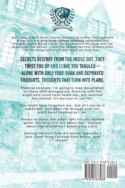 USA Today & Wall Street Journal bestselling author Tracy Lorraine brings you this dark bully college romance collection that includes Leon & Macie's duet: The Devastation You Reap and The Retaliation You Deliver- from the twisted lies that torment them to the dangerous truth that could set them free. Secrets destroy from the inside out. They twist you up and leave you tangled- alone with only your dark and depraved thoughts. Thoughts that turn into plans. Plans to retaliate. I'm going to reap devastation on those who wronged me. Starting with the angel who could have saved me... but damned me instead. It's my turn to use her. She might have forgotten me... but all I can do is remember. And when I'm through with her, she'll be as haunted as I am. Always so naïve, she plays right into my twisted game. Thinking this was about her- and not about the retaliation I desperately crave. Setting the truth free will poison everyone I love. Good thing I already hate Macie... and myself.