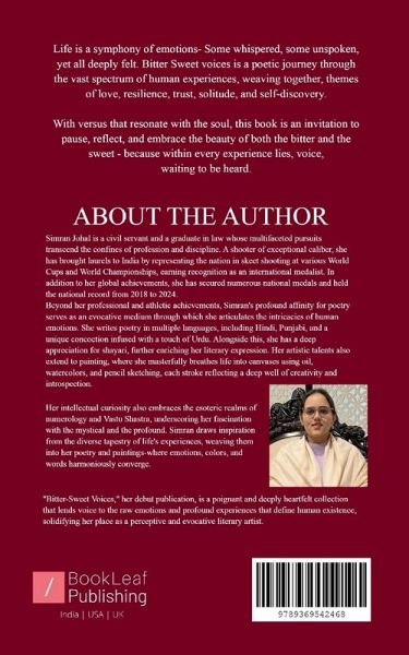 Life is a symphony of emotions- Some whispered, some unspoken, yet all deeply felt. Bitter Sweet voices is a poetic journey through the vast spectrum of human experiences, weaving together, themes of love, resilience, trust, solitude, and self-discovery. With versus that resonate with the soul, this book is an invitation to pause, reflect, and embrace the beauty of both the bitter and the sweet - because within every experience lies, voice, waiting to be heard.