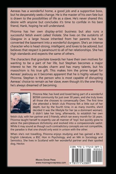 Aeneas has a wonderful home, a good job and a supportive boss, but he desperately seeks change. He is the master of his own fate but is drawn to the possibilities of life as a slave. He's never shared this desire with anyone but concludes it's time to confide in his best friend, Hank, hoping he will understand. Fhionna has her own display-artist business but also runs a successful fetish event called Violate. She lives on the outskirts of Glasgow in a large house inherited from her parents but has converted the basement into a wonderful dungeon. She's an intense character who is head-strong, intelligent, and loves to be adored, but believes that respect is paramount to all of her relationships. She has high standards and expects the same of others. The characters that gravitate towards her have their own motives for wanting to be a part of her life, but Stephan becomes a major interest to her. He exudes charm and has many talents, but his masochism is his true gift. This makes him the prime target for Aeneas' jealousy as it becomes apparent that he is highly valued by Fhionna. Stephan is the person who is most capable of disrupting Aeneas' choice to remain as her slave, even though it's the one thing he's always dreamed of becoming. About the Author: Fhionna Mac has lived and loved being part of a wonderful BDSM community for just over 30 years, and she truly loves all those she chooses to consensually Own. The first time she attended a fetish club Fhionna felt a little out of her depth, but by the fourth time, in as many months, she'd decided it was the lifestyle for her (as a dominant woman). It didn't take her long, afterwards, to establish her own fetish club, with her partner and 3 friends, which ran every month for 16 years. Fhionna taught herself to expertly use all manner of 'toys' but quickly grew to adore the pain/pleasure dichotomy and evolved into a compassionate sadist. While it may sound as though such contradictory concepts are not compatible, the paradox is that one should only exist in unison with the other. When she's not travelling, Fhionna enjoys studying and has gained a BA in English Literature, a BSC Hon in Psychology, and an MA in Sociology and Semiotics. She lives in Scotland with her wonderful partner and their spoiled dog, Hector.