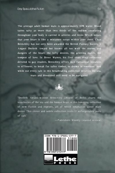 The average adult male is approximately 60% water. Blood tastes salty as more than two thirds of the sodium circulating throughout your body is carried in arteries and veins. Which means that your heart is like a miniature ocean within your chest. Chaz Brenchley has not only been awarded the British Fantasy Society's August Derleth Award but knows all too well the storms and dangers of the heart: the lofty desires, the grieving nadirs, the tempest of love. In Bitter Watters, his first short story collection devoted to gay readers, Brenchley offers men fantastical instances to effleurer, to break for taller timber, to drown in emotions. And while not every tale in this breathtaking collection involves the sea, tears and bloodshed still need to be navigated.