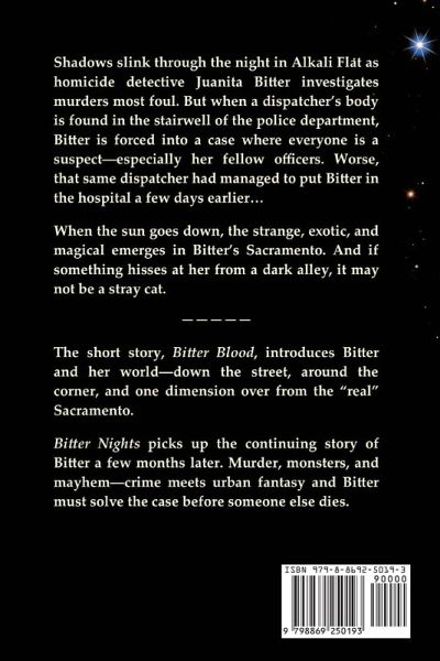 Shadows slink through the night in Alkali Flat as homicide detective Juanita Bitter investigates murders most foul. But when a Dispatcher's body is found in the stairwell of the police department, Bitter is forced into a case where everyone is a suspect-especially her fellow officers. Worse, that same Dispatcher had managed to put Bitter in the hospital a few days earlier... When the sun goes down, the strange, exotic, and magical emerges in Bitter's Sacramento. And if something hisses at her from a dark alley, it may not be a stray cat. ---------- The short story, Bitter Blood, introduces Bitter and her world¿down the street, around the corner, and one dimension over from the "real" Sacramento. Bitter Nights picks up the continuing story of Bitter a few months later. Murder, monsters, and mayhem¿crime meets urban fantasy and Bitter must solve the case before someone else dies.