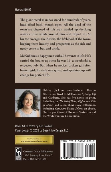 The giant metal man has stood for hundreds of years, head tilted back, mouth open. All the dead of the town are disposed of this way, carried up the long, staircase that winds around him and tipped in. At his toe emerges the Bitters, the lifeblood of the town, keeping them healthy and prosperous as the sick and needy come to buy and drink. McNubbin is a happy man with all he wants in life. He's carried the bodies up since he was 14, a worthwhile, respected job. But when he notices broken girl after broken girl, he can't stay quiet, and speaking up will change his perfect life. Shirley Jackson award-winner Kaaron Warren has lived in Melbourne, Sydney, Fiji and Canberra. She has five novels in print, including the The Grief Hole, Slights and Tide of Stone, and seven short story collections, including Cemetery Dance Selects, an eBook. She is a past Guest of Honor at Stokercon and the World Fantasy Convention.