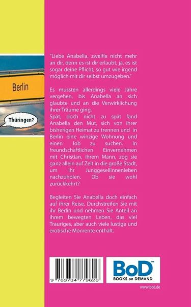 "Liebe Anabella, zweifle nicht mehr an dir, denn es ist dir erlaubt, ja, es ist sogar deine Pflicht, so gut wie irgend möglich mit dir selbst umzugeben."Es mussten allerdings viele Jahre vergehen, bis Anabella von dieser ihrer "Pflicht" überzeugt war. Aber dann wagte sie es. Spät, doch nicht zu spät fand Anabella nach vielen, zum Teil nicht ungefährlichen Irrwegen den Mut, sich von ihrer bisherigen Heimat zu trennen und sich in Berlin eine winzige Wohnung und einen Job zu suchen. In freundschaftlichen Einvernehmen mit Christian, ihrem Mann, zog sie ganz allein auf Zeit in die große Stadt, um ihr Junggesellinnenleben nachzuholen. Ob sie wohl zurückkehrt?Begleiten Sie Anabella doch einfach auf ihrer Reise. Durchstreifen Sie mit ihr Berlin und nehmen Sie Anteil an ihrem bewegten Leben, das viel Trauriges, aber auch viele lustige und erotische Momente enthält.