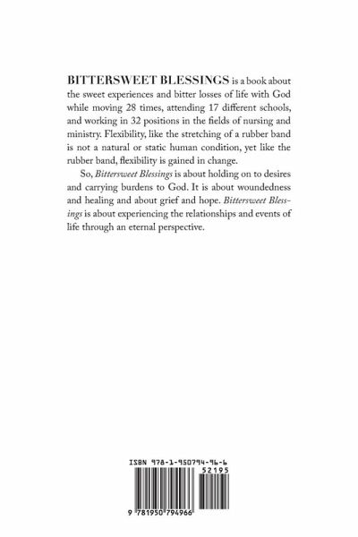 Bittersweet Blessings is a book about the sweet experiences and bitter losses of life with God while moving 28 times, attending 17 different schools, and working in 32 positions in the fields of nursing and ministry. Flexibility, like the stretching of a rubber band is not a natural or static human condition, yet like the rubber band, flexibility is gained in change. So, Bittersweet Blessings is about holding on to desires and carrying burdens to God. It is about woundedness and healing and about grief and hope. Bittersweet Blessings is about experiencing the relationships and events of life through an eternal perspective.