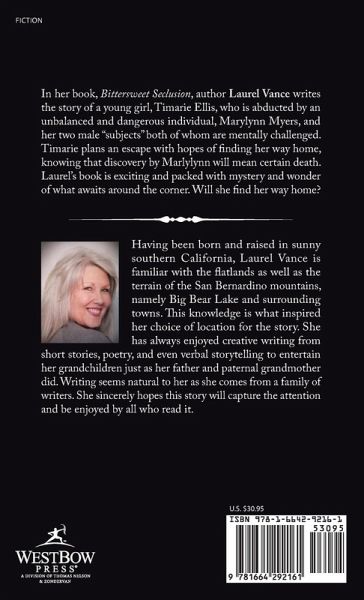 In her book, Bittersweet Seclusion, author Laurel Vance writes the story of a young girl, Timarie Ellis, who is abducted by an unbalanced and dangerous individual, Marylynn Myers, and her two male "subjects" both of whom are mentally challenged. Timarie plans an escape with hopes of finding her way home, knowing that discovery by Marlylynn will mean certain death. Laurel's book is exciting and packed with mystery and wonder of what awaits around the corner. Will she find her way home?