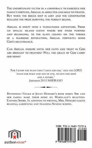 The unfortunate victim in a conspiracy to embezzle her family's fortune, Abigail is abducted and sold to pirates. But when the rogue ship is lost and the conspirator realizes the prize survives, the pursuit begins. Abigail is swept into a tumultuous adventure. From an idyllic island haven where she finds purpose and belonging, to the slave colony on the throes of a fearsome revolution, Abigail fervently seeks God's deliverance. Can Abigail endure until her faith and trust in God are brought to fruition? Will the grace of God carry her home? 'For I know the plans that I have for you,' says the LORD, 'plans for peace and not of evil, to give you hope and a future.' Jeremiah 29:11 NHEB(ASV)