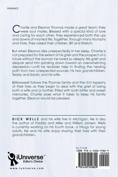 Charlie and Eleanor Thomas made a great team; they were soul mates. Blessed with a special kind of love and caring for each other, they experienced both the ups and downs of married life. Together, through many triumphs and trials, they raised their children, Bit and Stretch. But when Eleanor dies unexpectedly in her sleep, Charlie is not prepared for the extent of his grief and the prospect of a future without the woman he loved so deeply. His grief and despair send him spiraling down toward an overwhelming depression-until he receives help in finding the healing path from two unexpected sources: his two grandchildren, Teddy and Sarah; and his wife. Bittersweet follows the Thomas family and the rich tapestry of their lives as they begin to deal with the grief of losing both a wife and a mother. Filled with both bitter and sweet memories, Charlie does what it takes to keep his family together. Eleanor would be pleased.