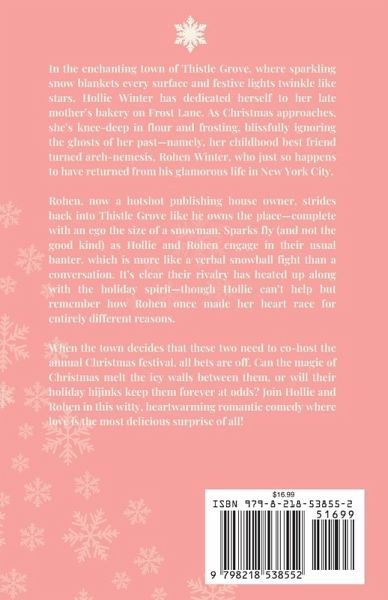 In the enchanting town of Thistle Grove, where sparkling snow blankets every surface and festive lights twinkle like stars, Hollie Winter has dedicated herself to her late mother's bakery on Frost Lane. As Christmas approaches, she's knee-deep in flour and frosting, blissfully ignoring the ghosts of her past-namely, her childhood best friend turned arch-nemesis, Rohen Winter, who just so happens to have returned from his glamorous life in New York City. Rohen, now a hotshot publishing house owner, strides back into Thistle Grove like he owns the place-complete with an ego the size of a snowman. Sparks fly (and not the good kind) as Hollie and Rohen engage in their usual banter, which is more like a verbal snowball fight than a conversation. It's clear their rivalry has heated up along with the holiday spirit-though Hollie can't help but remember how Rohen once made her heart race for entirely different reasons. When the town decides that these two need to co-host the annual Christmas festival, all bets are off. Can the magic of Christmas melt the icy walls between them, or will their holiday hijinks keep them forever at odds? Join Hollie and Rohen in this witty, heartwarming romantic comedy where love is the most delicious surprise of all!