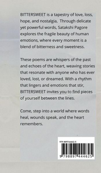 BITTERSWEET by Satakshi Pagore is a poignant journey through the highs and lows of life, where love, hope and despair, and dreams and reality intertwine. Told with raw emotion and deep introspection, this book explores the delicate balance between joy and sorrow, reminding us that even the sweetest moments can carry an ache of longing, and the bitter ones can hold unexpected beauty. Through evocative storytelling, BITTERSWEET captures the essence of fleeting moments, unspoken words, and the lingering taste of memories-both cherished and painful. A heart-touching narrative that will make you smile, cry, and reflect, this book is for anyone who has ever loved, lost, and found themselves in between.