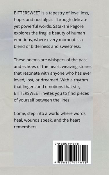 BITTERSWEET by Satakshi Pagore is a poignant journey through the highs and lows of life, where love, hope and despair, and dreams and reality intertwine. Told with raw emotion and deep introspection, this book explores the delicate balance between joy and sorrow, reminding us that even the sweetest moments can carry an ache of longing, and the bitter ones can hold unexpected beauty. Through evocative storytelling, BITTERSWEET captures the essence of fleeting moments, unspoken words, and the lingering taste of memories-both cherished and painful. A heart-touching narrative that will make you smile, cry, and reflect, this book is for anyone who has ever loved, lost, and found themselves in between.