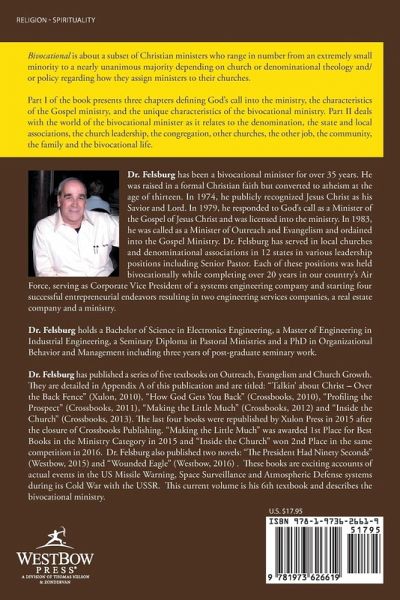 Dr. Felsburg has been a bivocational minister for over 35 years. He was raised in a formal Christian faith but converted to atheism at the age of thirteen. In 1974, he publicly recognized Jesus Christ as his Savior and Lord. In 1979, he responded to Gods call as a Minister of the Gospel of Jesus Christ and was licensed into the ministry. In 1983, he was called as a Minister of Outreach and Evangelism and ordained into the Gospel Ministry. Dr. Felsburg has served in local churches and denominational associations in 12 states in various leadership positions including Senior Pastor. Each of these positions was held bivocationally while completing over 20 years in our countrys Air Force, serving as Corporate Vice President of a systems engineering company and starting four successful entrepreneurial endeavors resulting in two engineering services companies, a real estate company and a ministry. Dr. Felsburg holds a Bachelor of Science in Electronics Engineering, a Master of Engineering in Industrial Engineering, a Seminary Diploma in Pastoral Ministries and a PhD in Organizational Behavior and Management including three years of post-graduate seminary work. Dr. Felsburg has published a series of five textbooks on Outreach, Evangelism and Church Growth. They are detailed in Appendix A of this publication and are titled: Talkin about Christ Over the Back Fence (Xulon, 2010), How God Gets You Back (Crossbooks, 2010), Profiling the Prospect (Crossbooks, 2011), Making the Little Much (Crossbooks, 2012) and Inside the Church (Crossbooks, 2013). The last four books were republished by Xulon Press in 2015 after the closure of Crossbooks Publishing. Making the Little Much was awarded 1st Place for Best Books in the Ministry Category in 2015 and Inside the Church won 2nd Place in the same competition in 2016. Dr. Felsburg also published two novels: The President Had Ninety Seconds (Westbow, 2015) and Wounded Eagle (Westbow, 2016) . These books are exciting accounts of actual events in the US Missile Warning, Space Surveillance and Atmospheric Defense systems during its Cold War with the USSR. This current volume is his 6th textbook and describes the bivocational ministry.