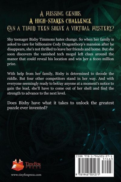 A missing genius. A high-stakes challenge. Can a timid teen solve a virtual mystery? Shy teenager Bixby Timmons hates change. So when her family is asked to care for billionaire Cody Dragonthorp's mansion after he disappears, she's not thrilled to leave her friends and home. But she soon discovers the vanished tech mogul left clues around the manor that could reveal his location and win her a $100 million prize.With help from her family, Bixby is determined to decode the riddle. But four other competitors stand in her way. And with everyone seemingly ready to betray anyone at a moment's notice to gain the lead, she'll have to come out of her shell and find the strength to advance to the next level.Does Bixby have what it takes to unlock the greatest puzzle ever invented?